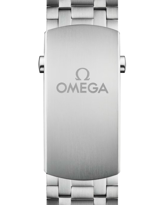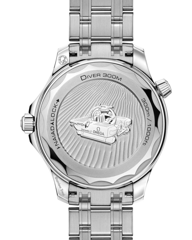 The caseback, embossed with the Nekton submarine medallion, is oriented with OMEGA’s innovative NAIAD LOCK. On this model, a stainless steel bracelet gives the divers’ watch a dressier look.
